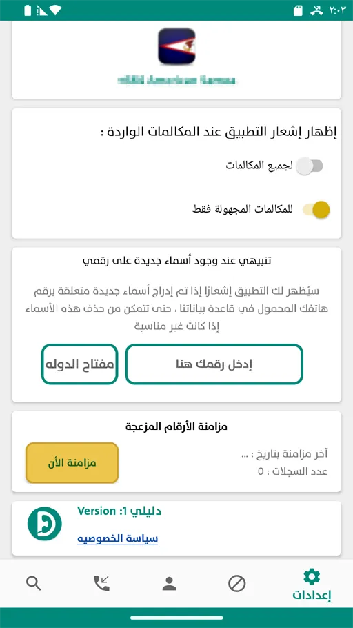 - الإعدادات ( Settings ) : أول صفحة في صفحات الواجهة داخل “برنامج Dalily Caller ID مهكر اخر اصدار” إن كان المٌستخدم قد قام بتفعيل اللغة العربية وهي واحدة من الصفحات المهمة نظراً لأنها خاصة بالإعدادات والتحكم, عن طريق تلك الصفحة سوف تتمكن من التحكم ببعض الأمور مِثل إشعارات المكالمات الدولية وإحصائيات رقم هاتفك واللغة المٌفعلة والدولة الخاصة بك.