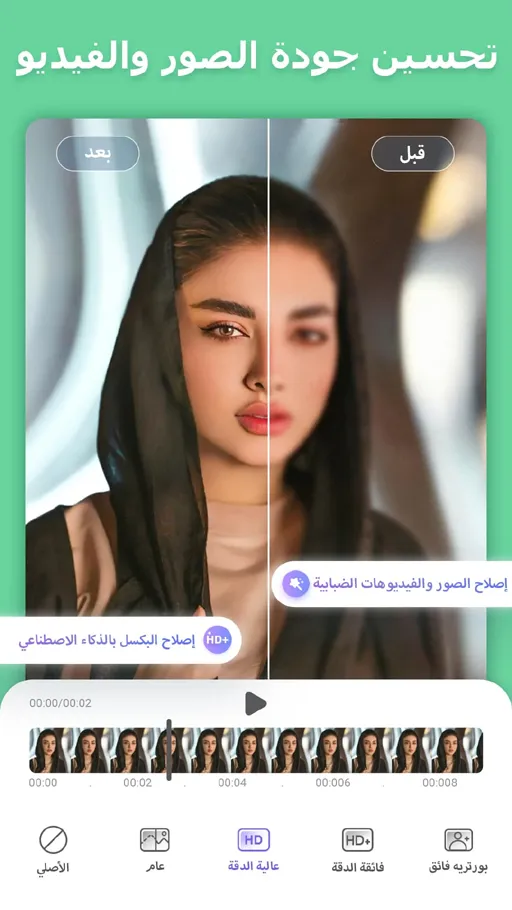 - تحسين الجودة : إذا كنت تمتلك صورة قديمة قليلة الجودة أو تحتوي على أي تشويش, تستطيع بكل سلاسة تحسين جودتها إلى أعلى حتى تصبح HD.