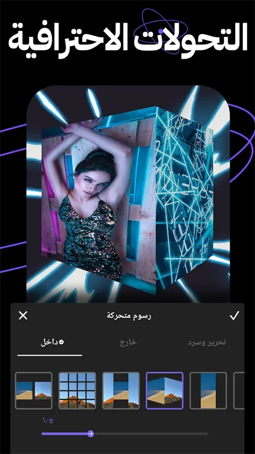 وبعد تحميل Vidma Video Maker Apk Mod بدون اعلانات يمكن استخدام انتقالات سينمائية لكي تزيد من احترافية الانتقال من المقطع للآخر، هذه الخدمة يمكنك استخدامها في عمل تعديلات مختلفة داخل الفيديو الواحد، حيث أن في صفحة التعديل تقوم بتحديد المقطع المراد لكي يتم تعديله دون أن تتأثر باقي المقاطع الأخرى بهذه التعديلات في برنامج Vidma Editor مهكر برابط مباشر.