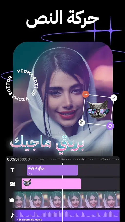 من الخدمات التي يوفرها تحميل تحديث Vidma Video Maker مهكر هي كتابة النصوص المتحركة على الفيديوهات باستخدام أدوات احترافية وبالتالي يمكن الاستعانة بهذه الخدمة في إضافة ترجمات وكتابة النصوص التي تعمل على توضيح بعض الأمور المرادة داخل المشروع، كما يتميز بتوفير العديد من العناصر التي يمكن الاستعانة بها في تحسين مظهر النصوص لكي يتوافق مع المشروع والتي تتمثل في: